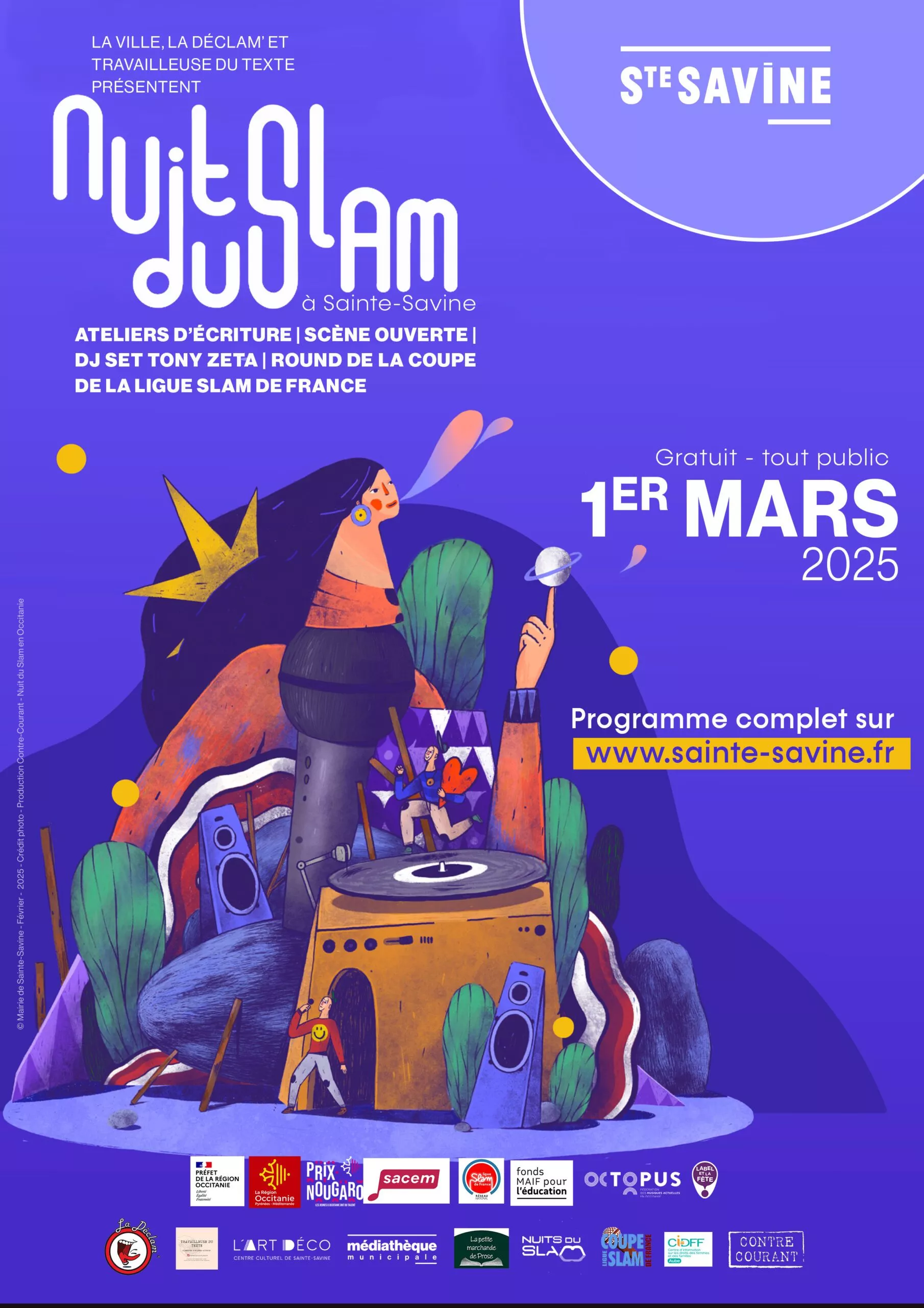Après le succès de sa première édition, La Nuit du Slam revient à Sainte-Savine ! En collaboration avec l’Association La Déclam et Travailleuse du Texte, cet événement incontournable de la scène slam francophone se tiendra le samedi 1er mars à l’Art Déco à Sainte-Savine.
